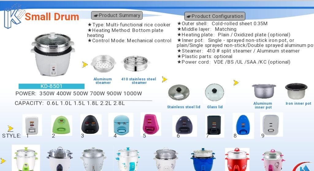 KD8501 Drum-Shaped Multi-Function Rice Cooker Offers multiple capacity options from 0.6L to 2.8L. Features bottom heating and mechanical controls for a stable structure. The outer shell is made of cold-rolled steel plate, paired with various inner pots (single-spray non-stick iron pot, single/double-spray aluminum pot, etc.) and optional steamers (aluminum/stainless steel). Multiple exterior designs and lid materials (stainless steel/glass) are available to meet diverse household and commercial needs.