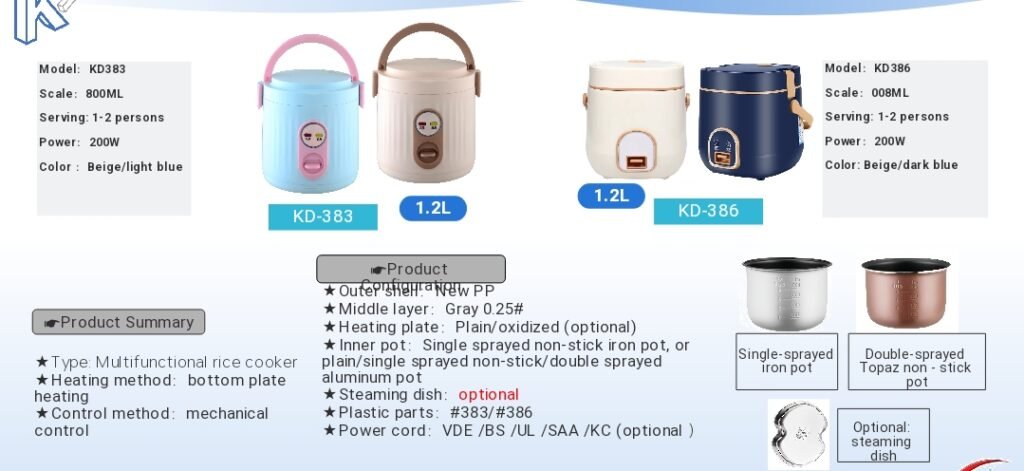 KD383/KD386 Multi-Function Mini Rice Cooker, 0.8L capacity, ideal for 1–2 people. Features bottom heating and mechanical controls for simple operation. New PP material housing with multiple inner pot options (single-spray non-stick iron pot, single/double-spray non-stick aluminum pot, etc.), supports optional steamer basket. 200W low-power design, ideal for dorm rooms, offices, small households, and similar settings.