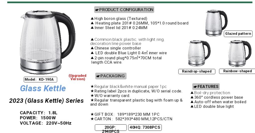 KD190A Glass Electric Kettle features a thickened borosilicate glass body, equipped with 1500W rapid heating, a 360° cordless base, dry-boil protection, and automatic power-off functionality. Its built-in LED blue light ring design offers an elegant appearance, available in multiple textures (such as raindrop and gradient patterns). With a 1.8L capacity, it is suitable for daily water needs in homes, offices, and other settings.