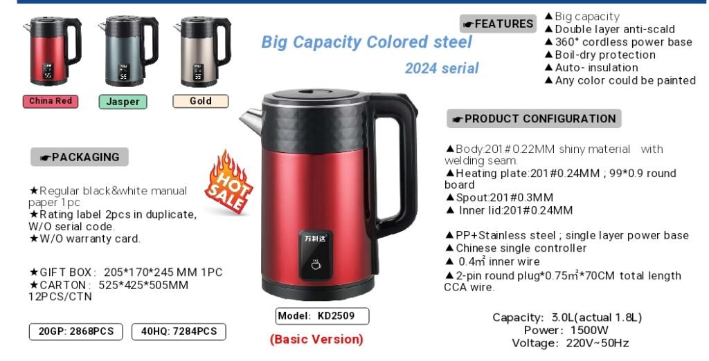 KD2509 Electric Kettle features a color stainless steel exterior with a double-layer anti-scald structure. It comes equipped with 1500W rapid heating, a 360° cordless base, dry-boil protection, and automatic keep-warm functionality. Capacity: 3.0L (actual 1.8L). Available in vibrant colors like China Red, Emerald Green, and Gold, its stylish design suits diverse settings.