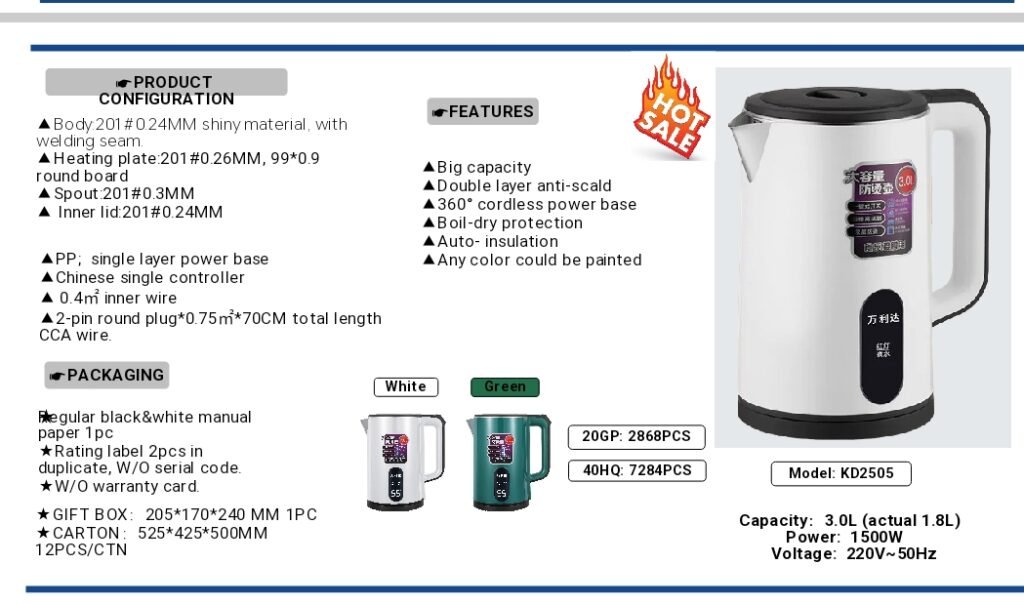 KD2505 Electric Kettle features a 201 stainless steel body with double-wall anti-scald design, equipped with a 1500W rapid heating system, 360° cordless base, dry-boil protection, and automatic keep-warm function. Capacity: 3.0L (actual 1.8L). Customizable appearance. Suitable for home and office settings.